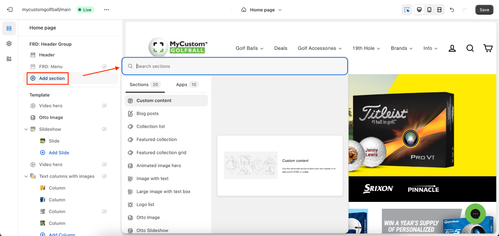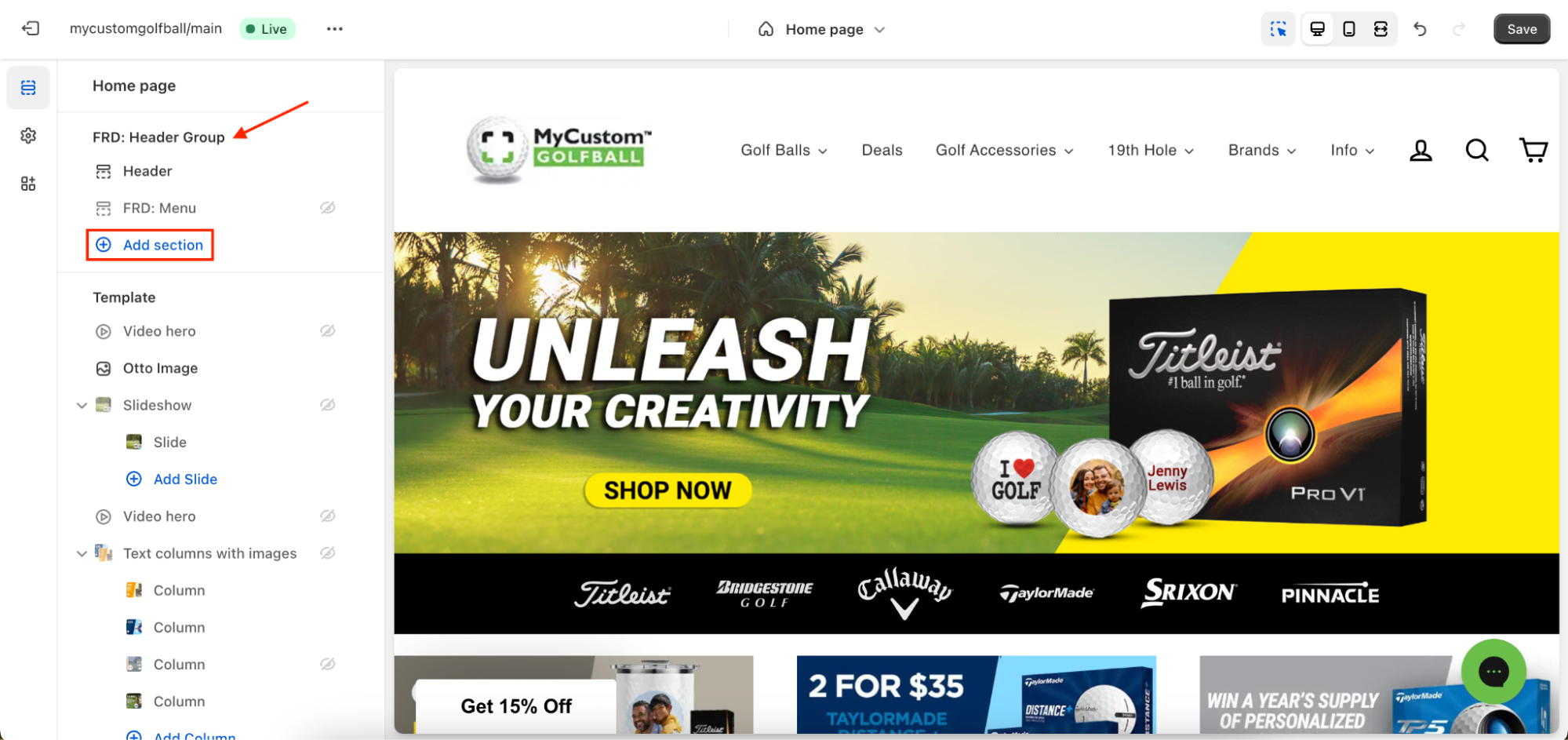 - On the left side of the theme customizer, locate your Header Group section, and click the + Add section link.