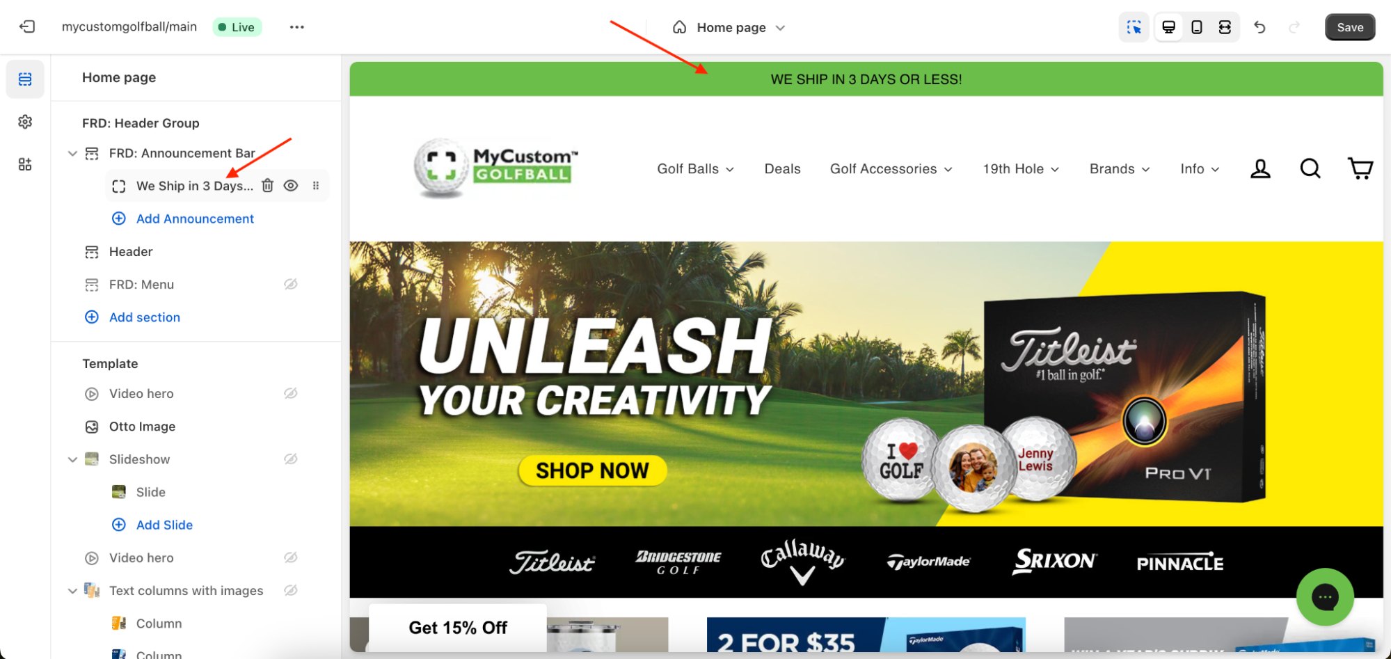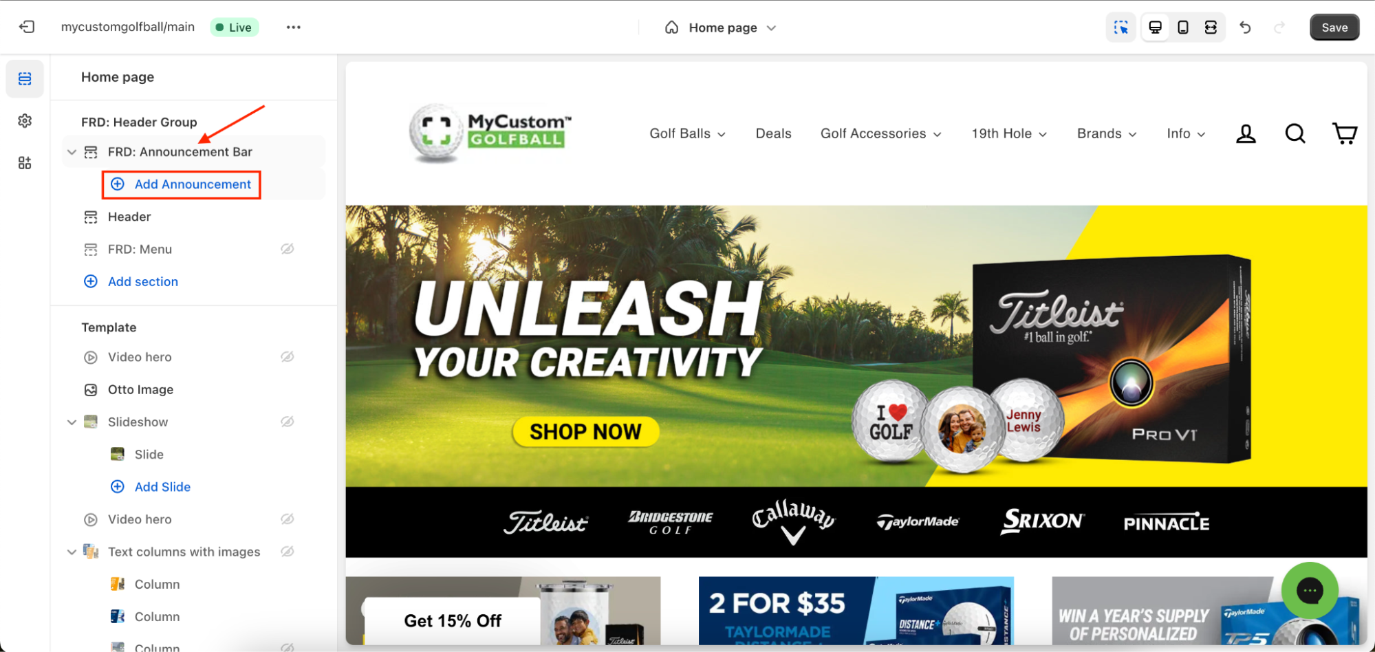 - On the left side of the theme customizer, locate your Announcement block located under your FRD: Announcement Bar section, move your mouse over it, and click it.