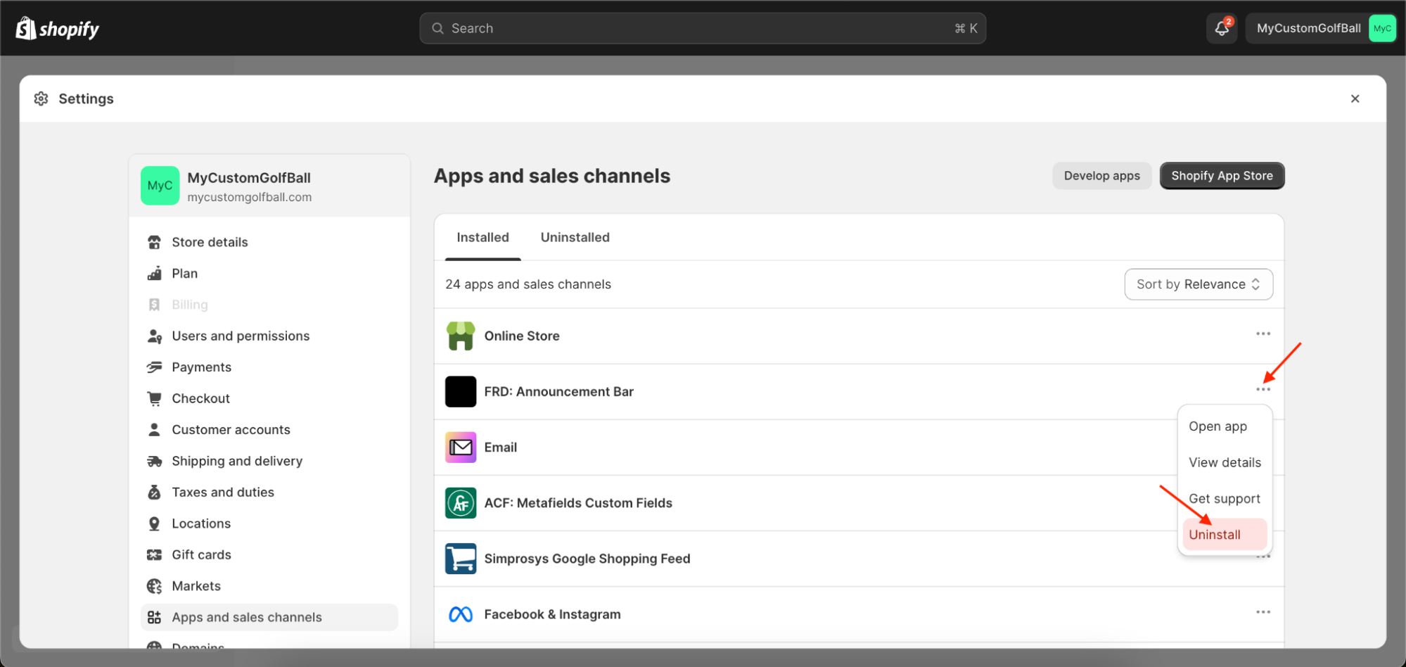 - On the right side of the Settings pop-up, locate the FRD: Announcement Bar app, move your mouse over it, and click the Uninstall link.