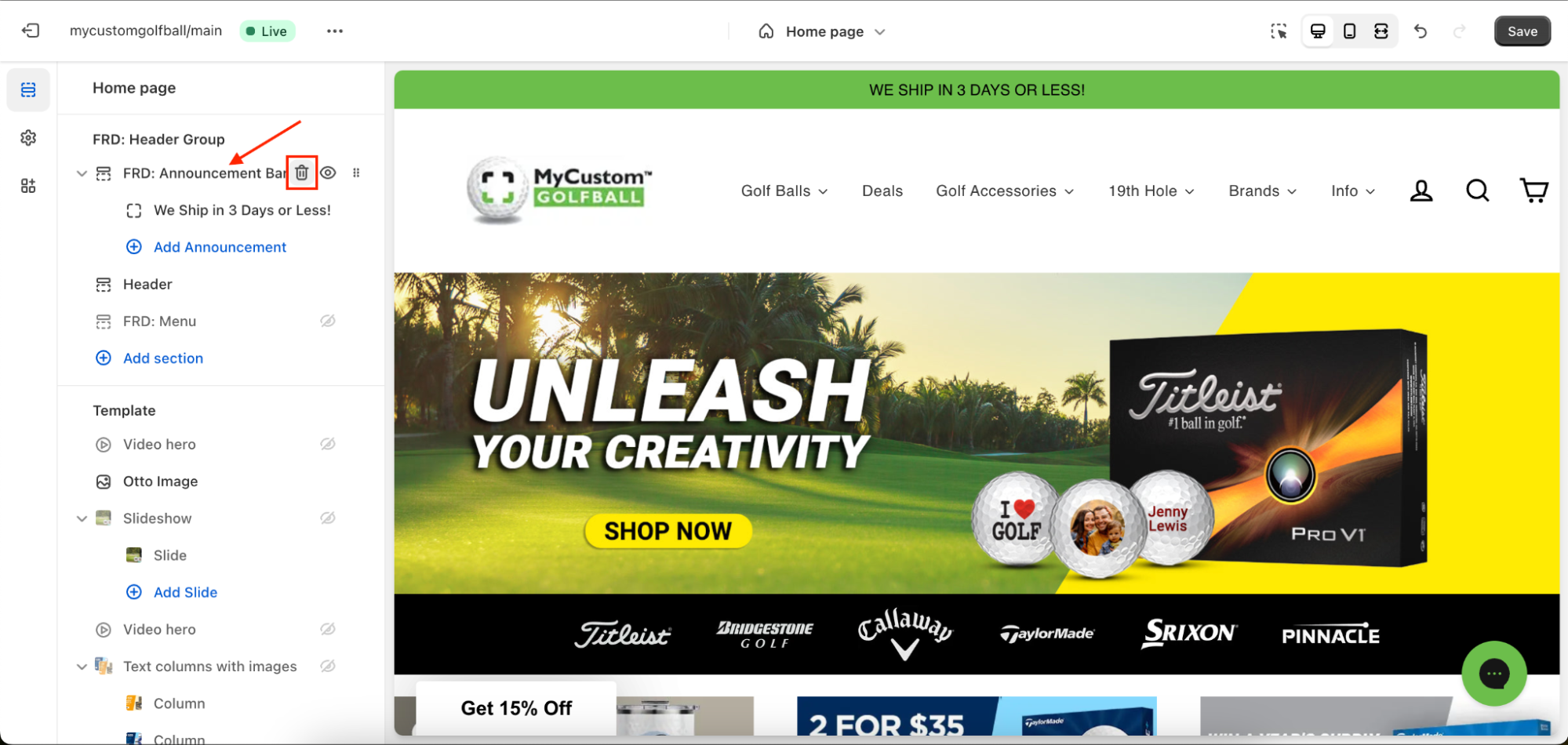 - On the left side of the theme customizer, locate your FRD: Announcement Bar section, move your mouse over it, and click the Trash icon.