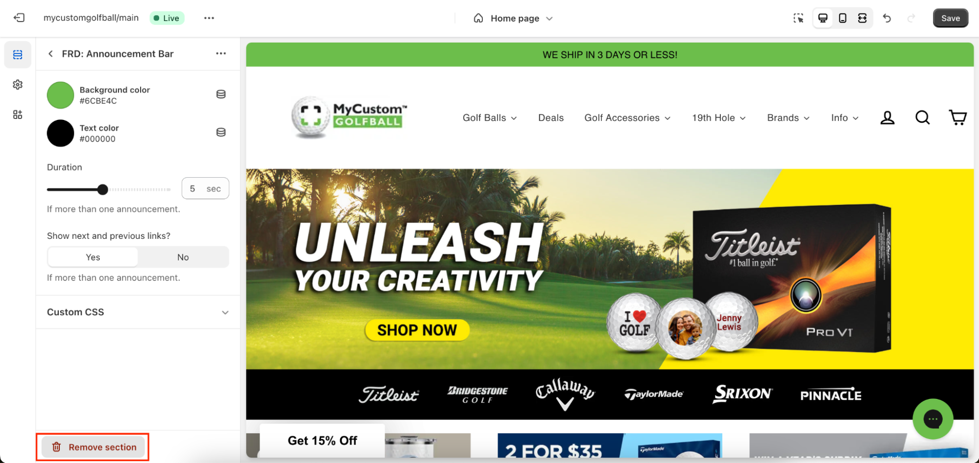 - If you are editing an announcement bar (clicked the announcement bar), click the Remove section link at the bottom.
