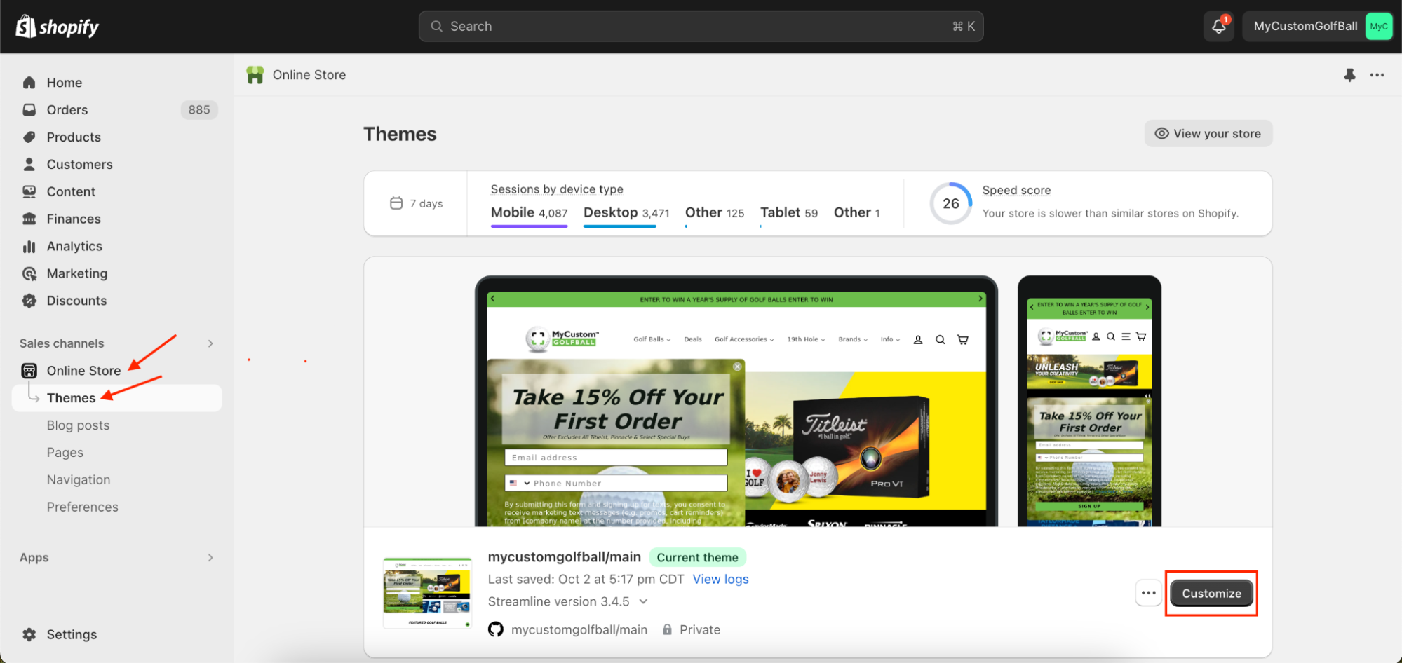 - When logged into your Shopify Admin, navigate to Online Store -> Themes -> Click the Customize button next to the theme you would like to add an announcement bar to.